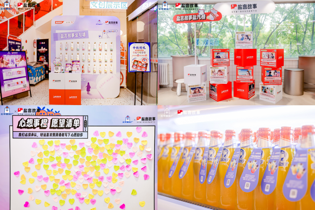 店内设有“故事金句墙”、“盐言故事品牌区”、“主角光环合影墙”、“盐汽榜展示区”、“盐言故事书摊”;店外则放置盐言故事作者、作品、金句内容等。
