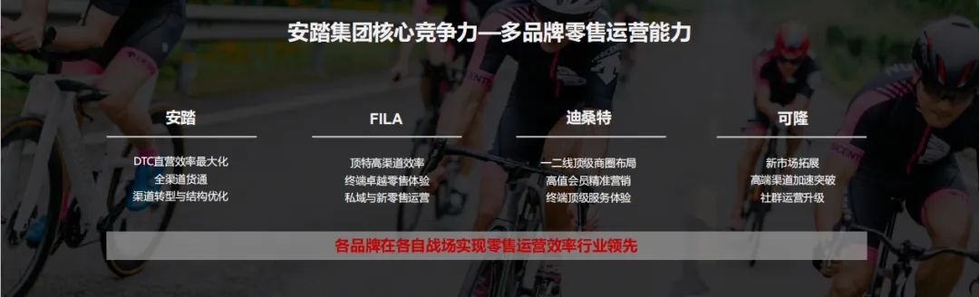 安踏集团拥有超过30年的渠道管理和终端运营经验,深知不同渠道模式的特点,可以根据安踏、FILA、迪桑特、可隆等不同品牌的特性,对其渠道进行差异化赋能,让他们在各自战场保持领先优势。