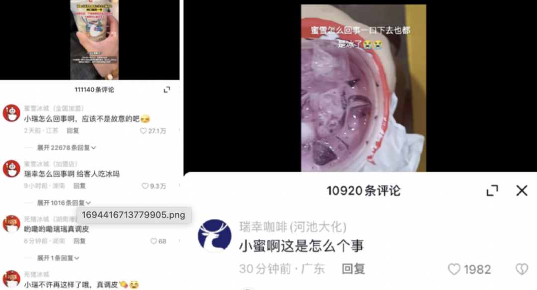 后有蜜雪冰城挑逗瑞幸,两家各自粉丝在评论区里疯狂battle、相互阴阳,看得网友不亦乐乎,一时间品牌增粉、点赞数十万。