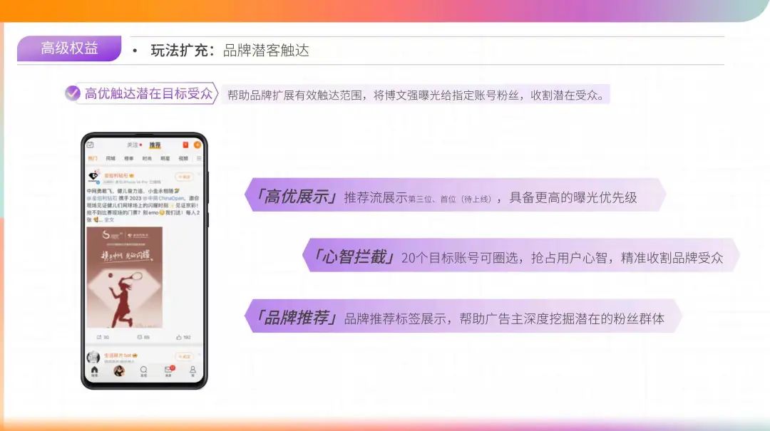 其优势在于,区别于普通博文,一方面,它能以高优先级展现+推荐流置顶吸睛位置,给予品牌强势曝光,最大程度保证触达有效率。