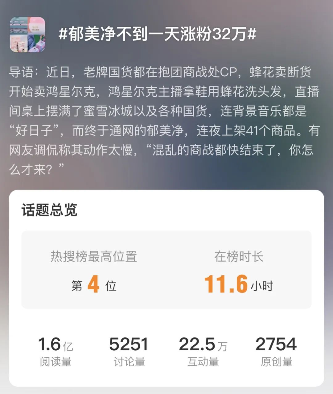 随后,蜂花官方账号发布视频称:已经卖断货,还有哪家国货没蹭上商战,花花帮忙宣传。紧接着,#郁美净不到一天涨粉32万#登上热搜。