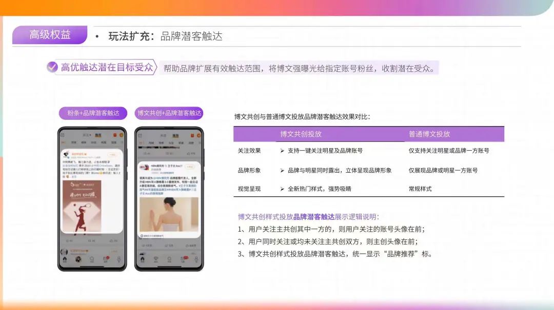 与明星/KOL联合,品牌在运营过程中,除单独投放品牌潜客触达之外,还可做品牌潜客触达+博文共创组合投放——即同时借助明星/KOL代言人和品牌影响力,在博文露出时,同时展示明星/KOL代言人和品牌二者双头像,以此面对全新的潜在定向人群,吸引大家一键关注明星/KOL代言人和品牌双账号,加速明星/KOL及品牌粉丝沉淀,孵化培育忠诚用户,进而反哺到品牌产品本身,让用户认同产品、认同品牌、实现品牌资产沉淀,落地品效合一。