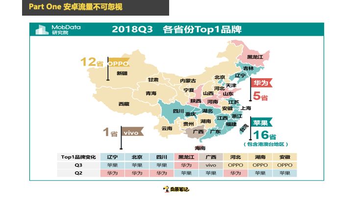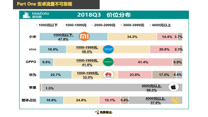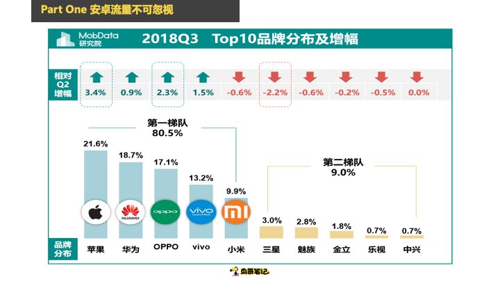 第一个这张图是一个MobData2018年Q3出的图,这些数据有很多第三方做报告提供的数据,但是每一家出来的数据都不同,我随便取了一家机构提供的数据。去年Q3的时候,苹果市场差不多就20%,整个安卓市场占了80%的流量,这个我在说量。安卓手机的用户量是苹果的四倍,其实这张图就说了这一个,靠前的品牌可以看到华为、OPPO、vivo、小米,安卓的量有这么多。