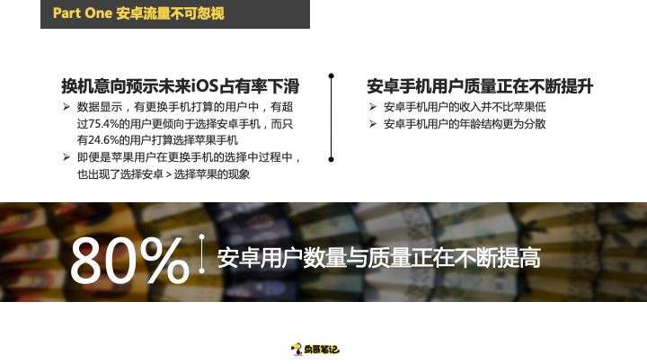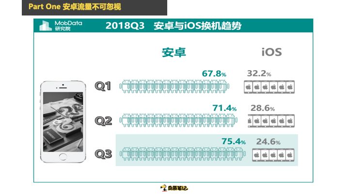 第三个这是一个换机的印象,当一个用户想要换手机的时候,2018年Q1有87.8%打算换安卓,32%想换苹果。到Q3只有24%打算换苹果,有75%准备换安卓手机,前段时间华为的广告大家也看到了,人在做华为P30在看,很多人都在想要不要换一个华为的手机。按照我个人的预测我会认为接下来再换手机,这个数字还会不断的调整,甚至想换安卓手机的用户数会远远超过80%。这就意味着苹果的市场份额会越来越小,安卓的流量会越来越大。这里我说的是安卓的量大,但是质怎么样呢?