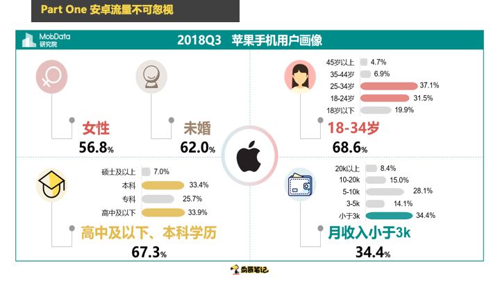 我们以前开玩笑说vivo是小镇青年,OPPO是小城青年,华为高一点,苹果当然四千块以上。什么叫质?去年有一张图大家都传的特别厉害,说用苹果手机叫隐性贫困人口。当时大家很多人都觉得这是说笑,当这组数据出来的时候,是不是真的说笑。为什么苹果端贷款用户这么多,贷的这么起劲?因为穷。34%的苹果手机用户月收入不足三千块,我不说你们敢不敢信,其实很多这些报告网上都能找到,女性多一点,18-34岁是主流的,高中级以下的用户占了33%。这是一个什么概念?是一群什么样的人在用苹果手机,当然高端的也有,本科研究生收入很高的太多了,苹果手机用户就是这样一个质量。