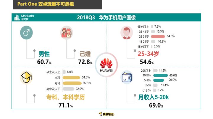再往下看华为60%是男性,所有用户72%是已婚,专科和本科学历的人占了70%,华为用户比苹果手机用户学历高多了,学历这么高再去投放一个专升本的东西投合适吗?肯定没有在苹果合适,人家学历已经有了,月收入在5-20K之间,这群就是华为的用户。