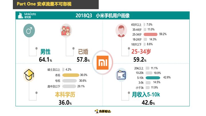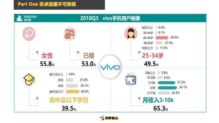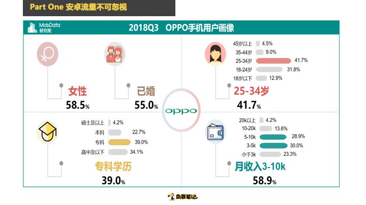 这个是OPPO的,女性58%,已婚55%,3-10K的用户占大头,专科学历占大头。