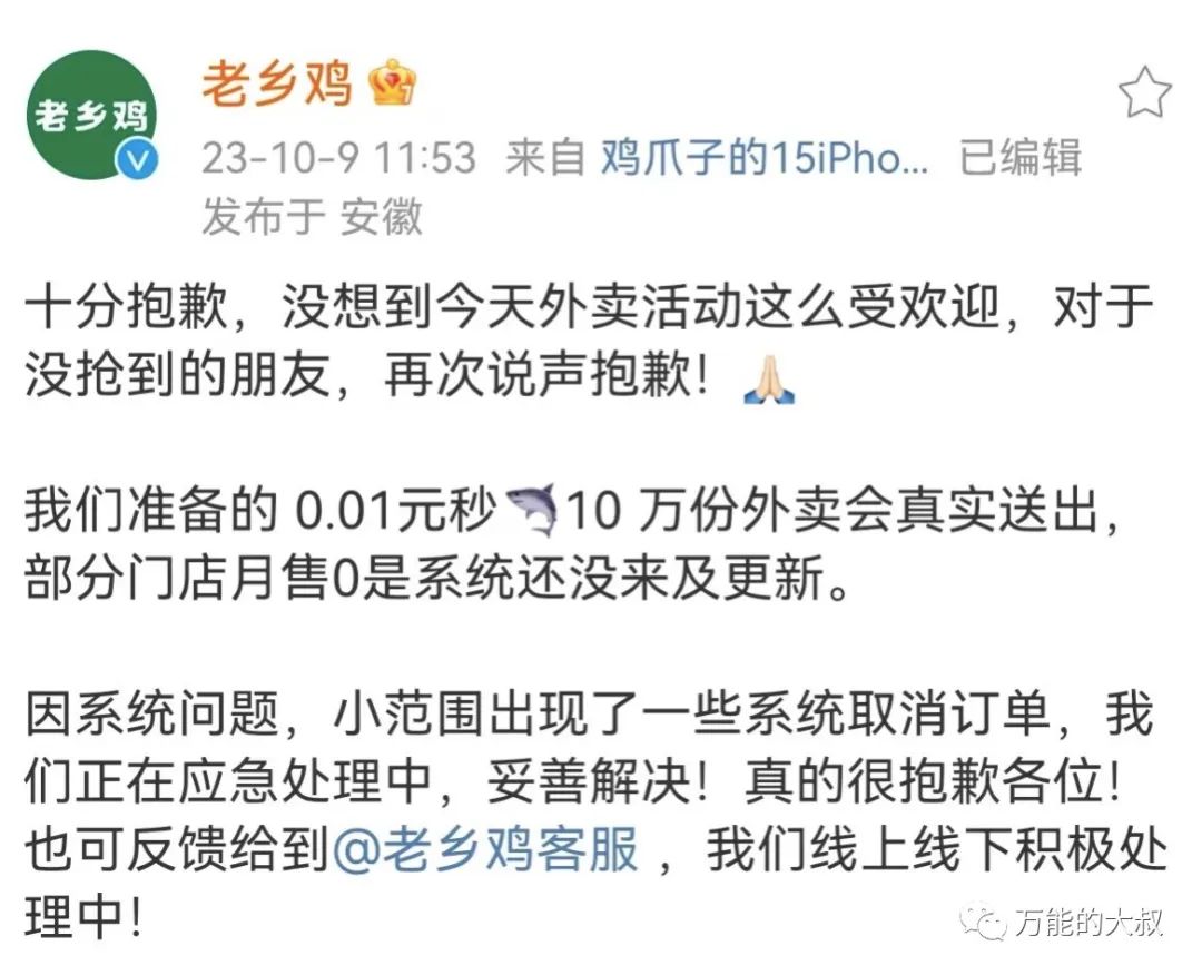 在9日中午11点53分,@老乡鸡 发文:十分道歉,并承诺妥善解决。官方开始主动释放多巴胺了。(先划个重点,下面会解释)