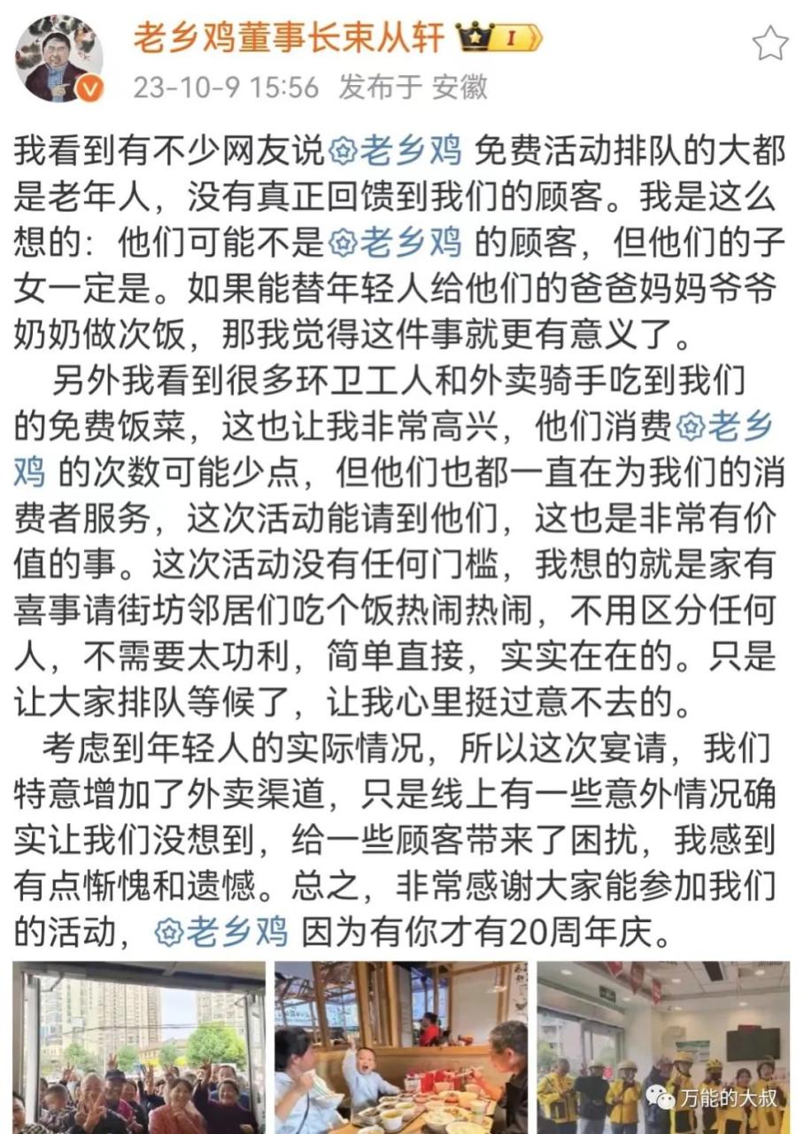 10月8日,@老乡鸡 免费请全国人民吃午餐。