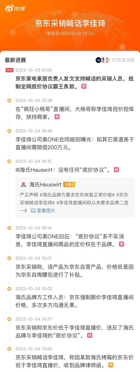 事情大致是这样的,京东通过自身的平台补贴让某款海氏烤箱产品穿透了李佳琦直播间最低价,随即收到了品牌方律师函,此后爆出李佳琦公司美ONE的“底价协议”。如今,身处抖音电商阵营的大杨哥也来痛斥李佳琦控价空库存、挟持商家。