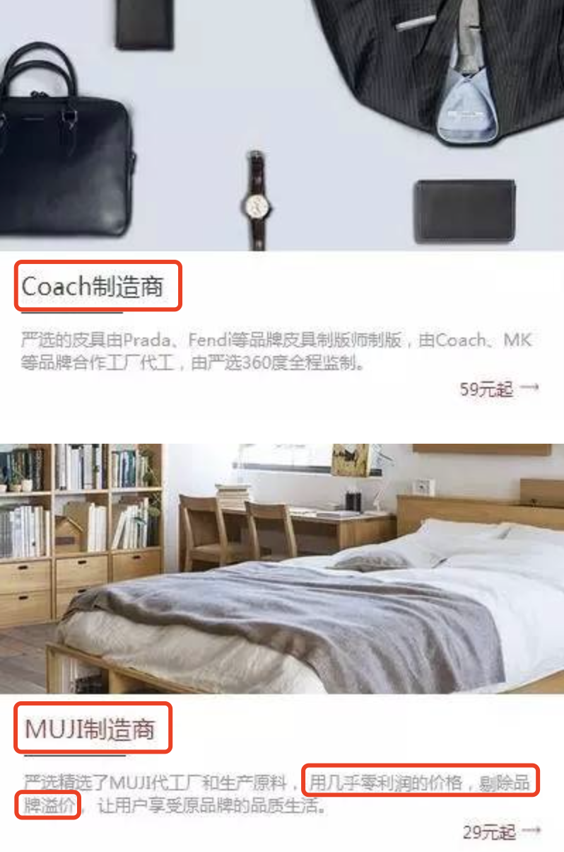 在这类项目中,它们主要瞄准那些大牌代工厂或产业带的知名工厂,为其提供营销渠道,以“**品牌代工厂”“**大牌制造商”的宣传语去打知名度和信任度,再以“低至**品牌几折”“零利润剔除品牌溢价”的方式促进购买转化。——你可以说,在传播中起到关键作用的就是那些大品牌的名称。