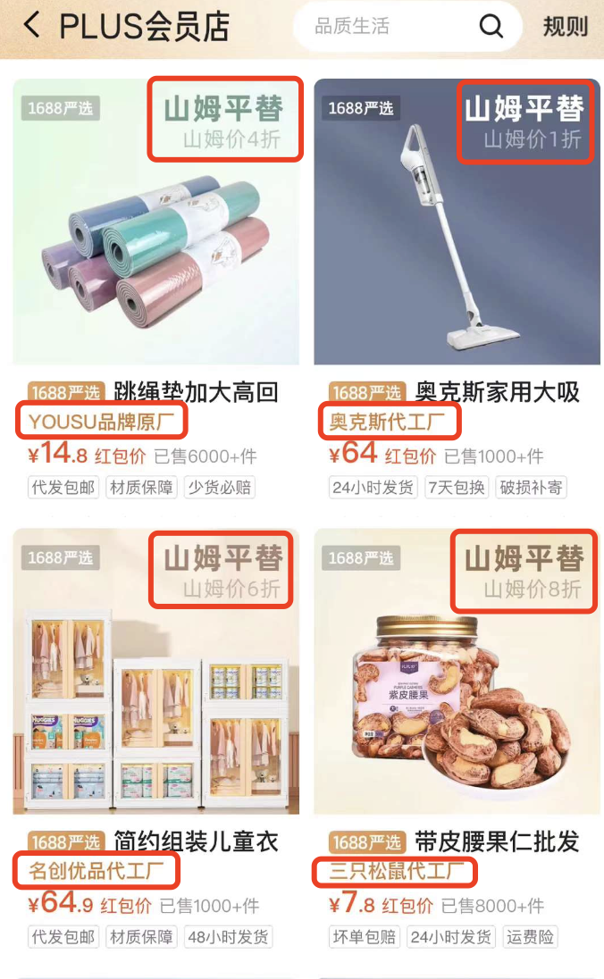 最近,我看到一篇文章里提到,阿里的1688搞了个严选频道,严选频道又推出了plus会员店,直接对标山姆,以“山姆平替”作为醒目宣传语,扶持各大品牌代工厂直接做品牌和销售。
