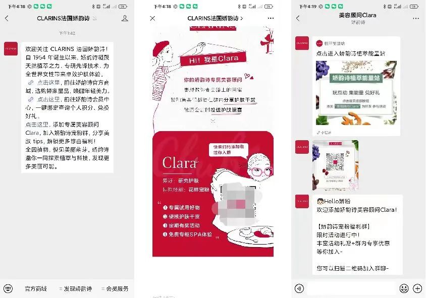 「CLARINS法国娇韵诗」公众号在欢迎语中设有私域社群的引流入口,具体路径: