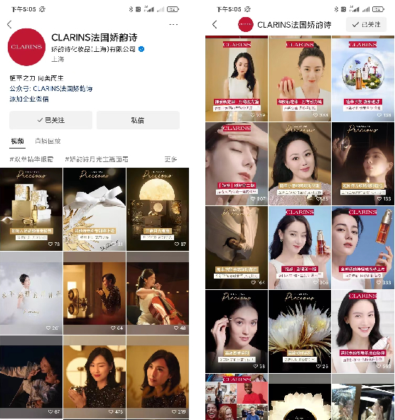 娇韵诗在抖音建立了矩阵,2个号的总粉丝量超126万。视频内容包括品牌宣传、新品上市、产品种草,账号主页放置了官网的链接进行引流。
