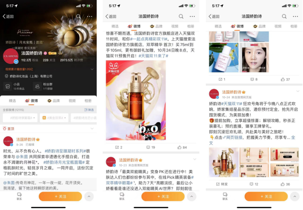 娇韵诗在微博的粉丝数为112.3万,其微博发布数量达到了12115条,翻阅最近几天的微博,每天都保持2-3条的发送频率,有活动的时候4-5条/天。