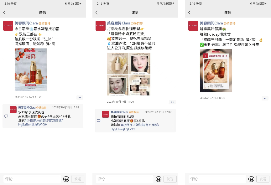 2)IP形象丰富:娇韵诗的朋友圈内容比较丰富,除了产品推荐、品牌活动外,也有节日问候和护肤分享,容易得到客户信任,为后续转化奠定基础。