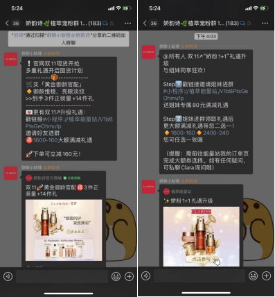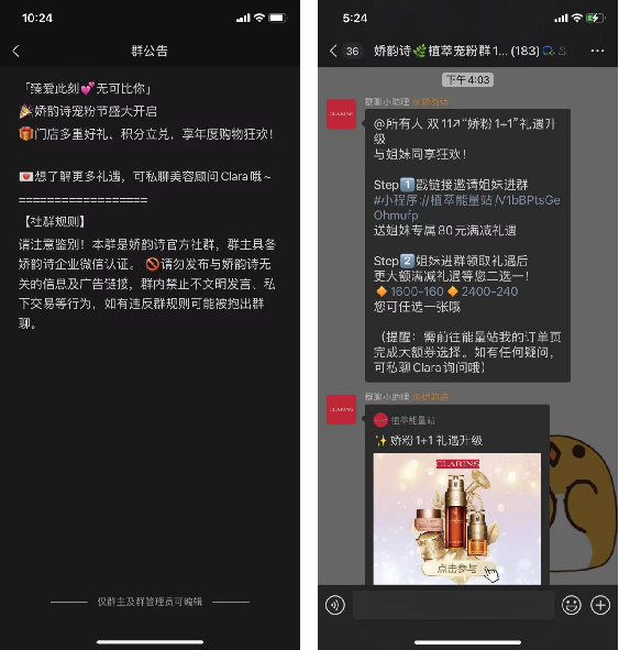 社群是私域中促活最有效也是最常见的场景,娇韵诗通过社群的运营,增加产品的曝光和转化。下面进行详细拆解: