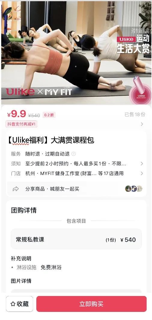 此外,抖音生活服务还顺势推出了Ulike与5KM舞蹈室、MYFIT健身房联名的运动套餐,购买与品牌联名的福利套餐,即可享受运动体验课与脱毛体验卡,带动品牌和商家同步完成流量转化。在平台层面,“精致运动上抖音”、“吃喝玩乐上抖音”的内容消费心智,也在这一过程中得到了有效传递,实现了三方共赢。