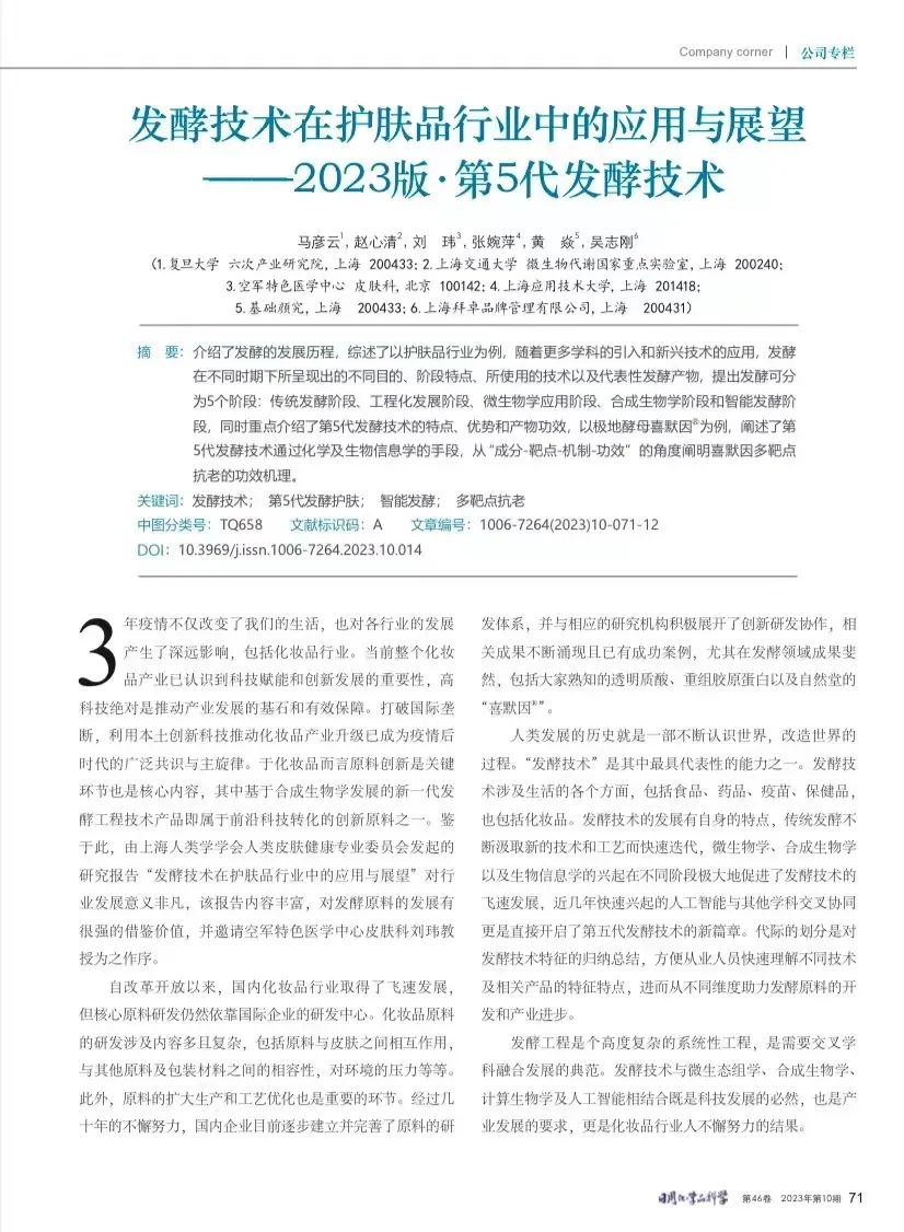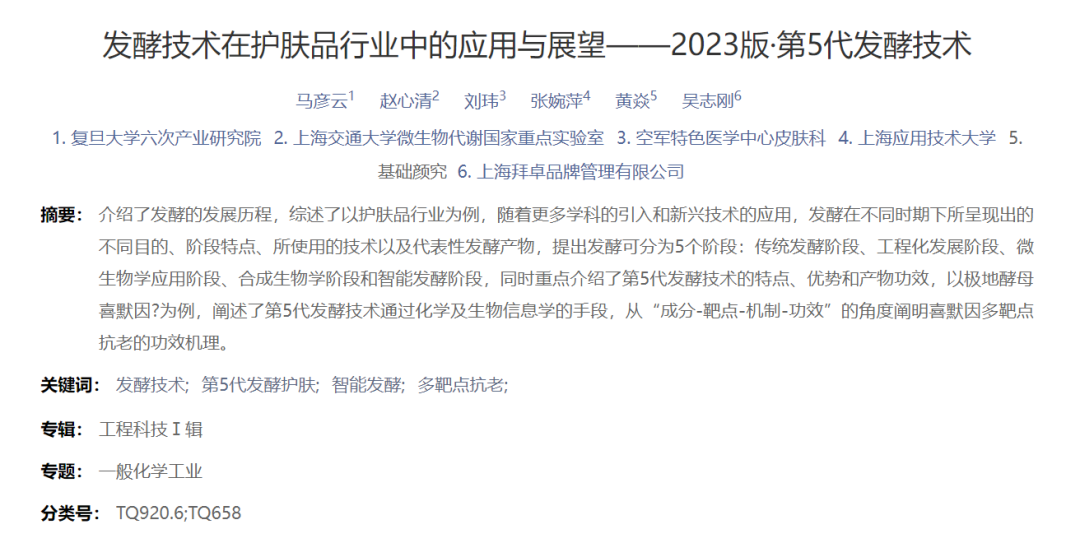 发酵技术白皮书从历史、原理、应用等角度,阐述了发酵技术在护肤行业的应用前景,定义发酵技术代际划分,概括了发酵技术在抗老方面的主要应用,重点分析第五代发酵技术“成分-机理-功效”路径清晰、得以根据目标对发酵工艺再做调整、提高批次间的质量稳定性、持续优化护肤功效的卓越优势,将对科技创新型原料开发带来更多技术内涵,助力本土护肤品行业的科技迭代,引发行业高度关注。