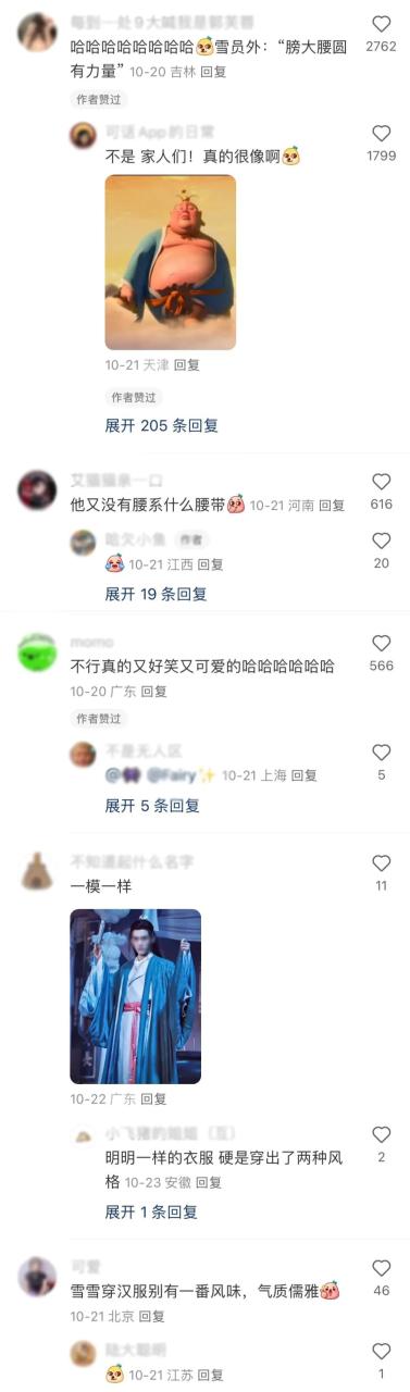 雪王的汉服形象,还引发了网友与品牌的互动,有人找到了影视剧中同种色系的服饰,有人发现了雪王IP与经典动漫中的人物形象惊人的相似,还有人调侃起了雪王IP形象没腰还系腰带,也有人夸赞起了雪王服饰变化后的整个气质变化。