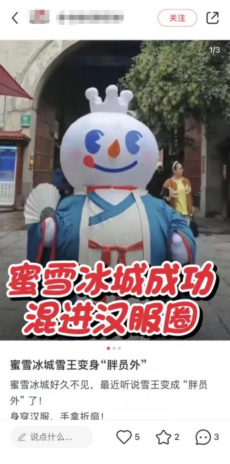 社交媒体的推波助澜:蜜雪冰城雪王IP形象的转变,吸引了喜欢分享自己生活的年轻人,产生了超高的关注、讨论与分享,随着社交媒体上雪王IP穿汉服的内容增多,形成了二次传播。