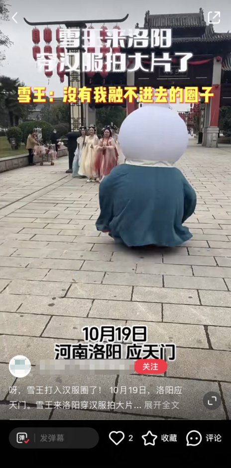 极其应景的传播氛围:还有一个因素是,雪王出现的地点很应景。河南洛阳的应天门是重要的历史遗迹,也是汉服爱好者的聚集地。这里的古色古香的城墙和丰富的历史文化气息,为雪王穿汉服出场增添了更多的神秘感和历史感,也让年轻人再次领略到了古都洛阳的魅力。这不仅是一次对古都文化的致敬,也是对中华优秀传统文化的传承和弘扬。可以说,富有文化底蕴的古迹,加上应景的营销,助力蜜雪冰城的传播再次爆火出圈。
