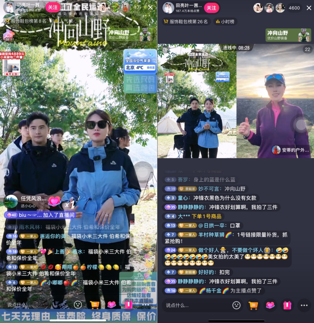 在【抖in全民运动•冲向山野】行业IP营销活动期间,抖音商城就邀请田亮、叶一茜夫妻打造一场户外直播专场,通过户外真实场景,以及与户外潮推官的创意连麦,实现内容场向货架场的引导。