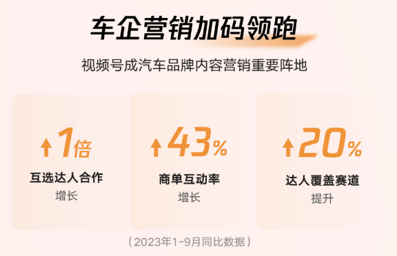 腾讯广告互选平台是品牌方和创作者双向互选、自由达成内容合作的交易平台。今年前三季度,腾讯广告互选平台上的互选创作者,同比增长超过2倍,下单的广告主同比增长1倍。其中视频号已经成为汽车品牌内容营销的重要阵地,视频号互选达人合作增长1倍,商单互动率增长43%,达人覆盖赛道提升20%。