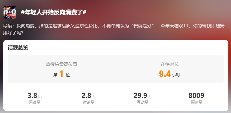 比如前不久,因年轻人“报复性省钱”的行为产生的反向消费现象,就产生了广泛的热议,积累了3.8亿阅读。这反应出年轻人在选择产品的过程中,并不是从单一的信息考量,而是根据品质、性价比等多重信息来决定自己的消费行为。