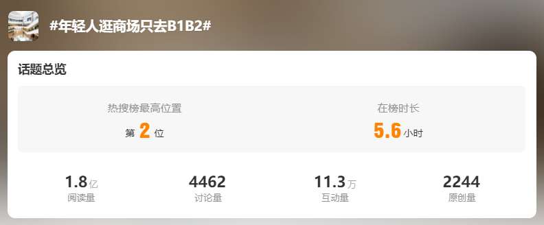 而昨天,#年轻人逛商场只去B1B2#的微博话题再次引发了广泛的讨论,产生了超1.8亿的阅读量,累计了超11万的互动量。