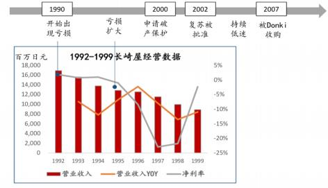从下图我们可以看到长崎屋在 1990 起开始出现亏损,此后亏损扩大,营业收入和净利率快速下滑濒临破产,2000 年申请破产保护后但持续低迷,直至 2007年被堂吉诃德收购。