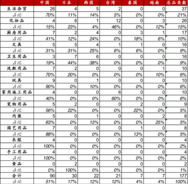 日本的代工厂主要生产:卫生用品和食品,韩国代工厂主要生产卫生用品,泰国和越南也有一部分代工厂,主要生产厨房用品、软装用品、文具、园艺用品、化妆品和宠物用品。