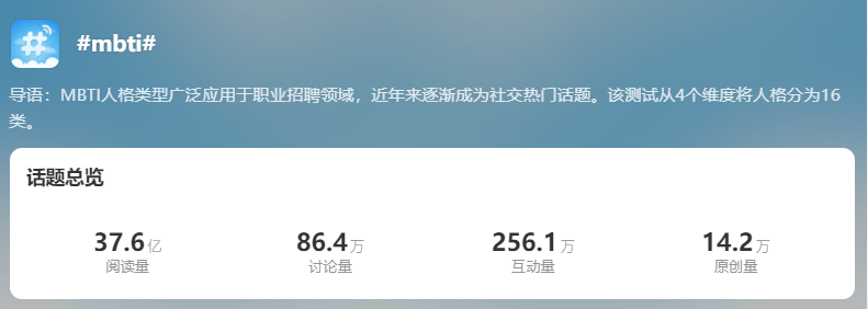 仅在微博上,#mbti#相关话题已经产生超过37亿+阅读量,并将互动量带到了一个新高度。