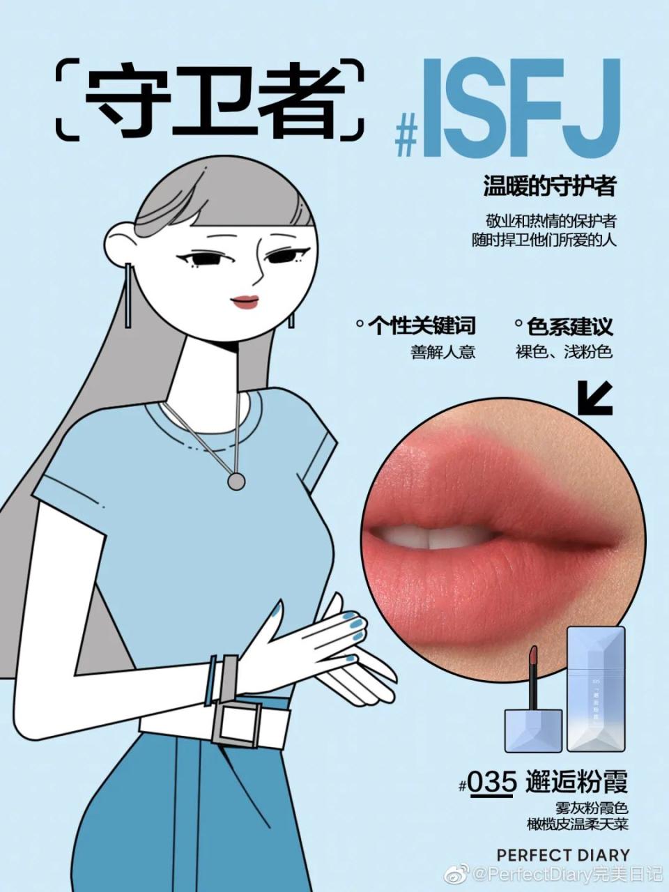 而完美日记则是根据MBTI的16种性格特征,推出了具有针对性的产品营销,给不用性格的人提供了使用口红颜色的建议,如严谨逻辑的现实主义(ISTJ)因个性稳健温柔,推荐了豆沙、肉桂色。而完美日记也凭借“从MBTI开始 探索自己更多可能性”的营销,巧妙地将产品与用户消费倾向联系到一起,让营销更具说服力。