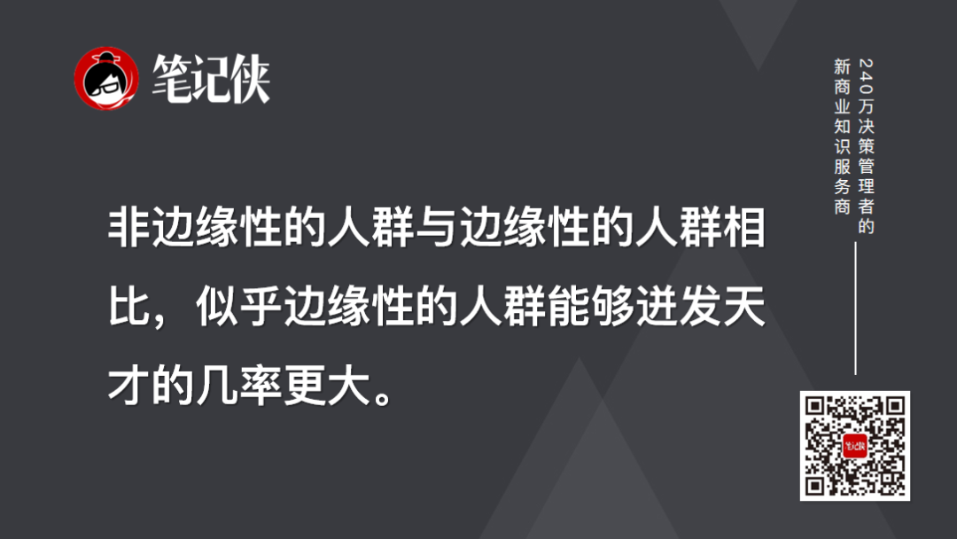 非边缘性的人群与边缘性的人群相比,似乎边缘性的人群能够迸发天才的几率更大。