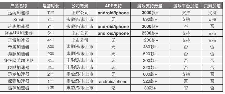 在我们进入该红海之前,市场已存在数十款同类型产品,分布排名大致如下:迅游、网易、腾讯等一梯队,雷神、海豚、熊猫等二梯队,以及数款三梯队产品。