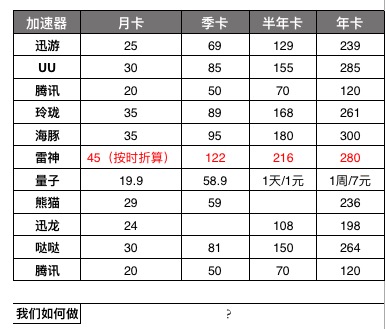 目前市场最低价格为18元一月(腾讯加速器),收割了长尾流量(即学生用户、消费能力弱或付费意愿差等用户),这类用户等于被高中端筛选下来的用户。对加速品质要求一般,追求性价比,适合早期产品或小团队切入,团队综合预算低。