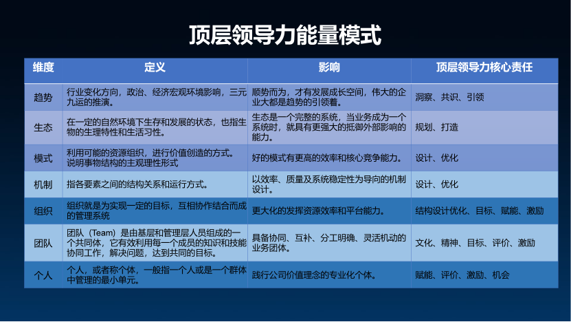 当然,生态或趋势作为更高层次的存在,并非我们作为领导者能立即改变,这需要时间。然而,个人、团队、组织、机制或模式这些层次,我们都可以通过努力和能力去改变进而实现。
