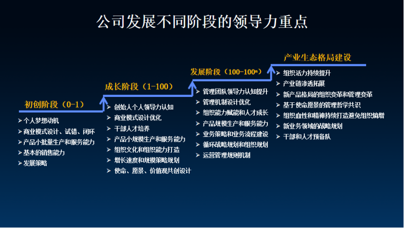 我们常说,一个公司的成长是一个循序渐进的过程,从初创时期开始逐渐发展壮大,最终影响整个行业生态。在这个过程中,每个阶段对领导者的要求都是不同的。