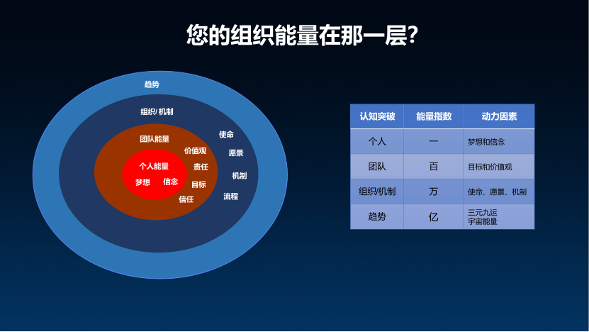 上图展示了个人、团队、组织、机制以及趋势在组织中的能量级别差异。