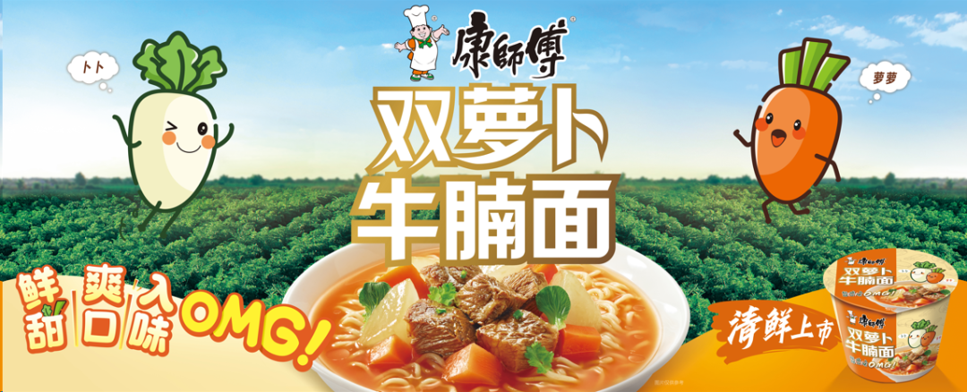在此大背景下,康师傅精选优质食材,以清甜白萝卜、爽脆胡萝卜为原材料,并结合炖煮牛腩,打造出“鲜甜、爽口、浓郁”的“双萝卜牛腩面”。