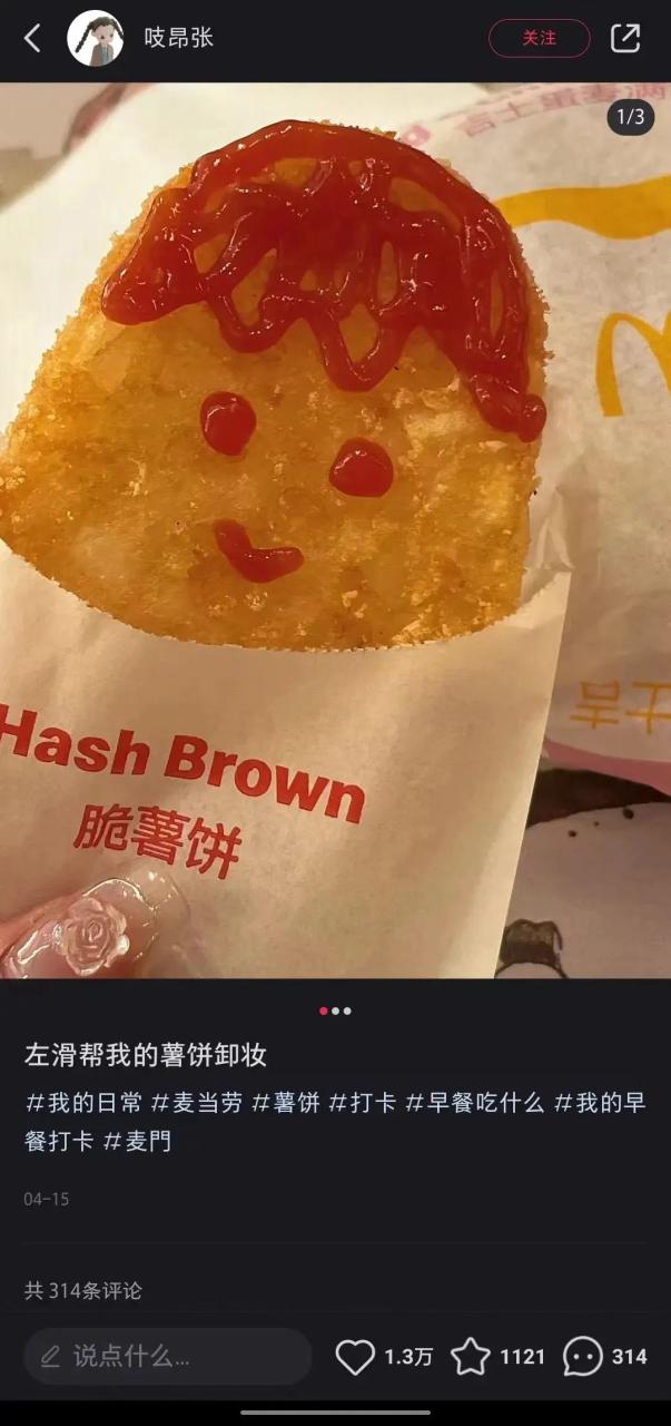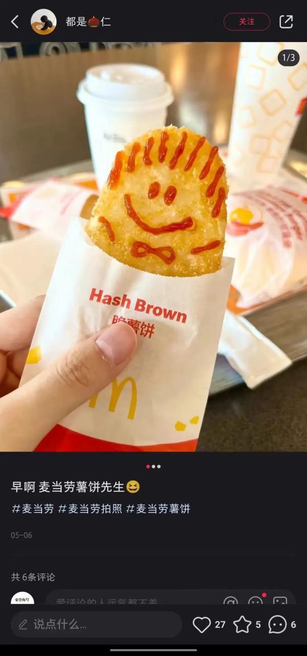 Joanne 给我举了个例子:在小红书上有用户 PO 出了一张图,是用麦当劳番茄酱在薯饼上画了一个笑脸,看到的瞬间,不仅会觉得这个东西很好吃,还能感受到这背后的情绪状态,给人一种生活被点亮了的感觉。这是独属于小红书的内容特色,也正是麦当劳想要对外传达的品牌态度。