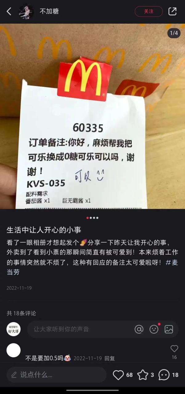 在小红书上,有用户分享在麦当劳点单时,他会在备注里写“麦门!能不能送我一根脆脆薯条!”,结果店员真的送了他一根,还会在随餐的小票上回复“麦门!”,仿佛形成了一种“麦门密码”。有用户刷到这条去留言评论,他也模仿去做,一来二去的这个梗就在小红书上火了起来。