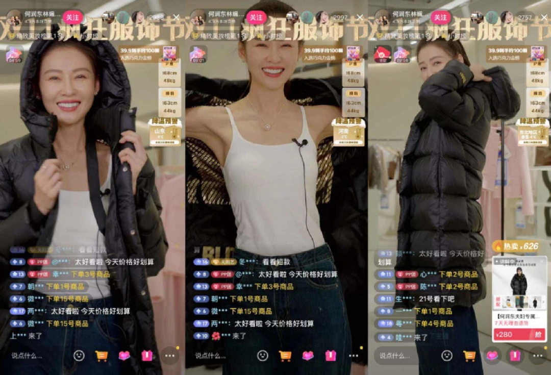 数据显示,@何润东林姵希夫妇 在10月23日双十一首场直播中,平均看播时长超1分36s,冰飞品牌羽绒服上架即售卖超2000单。