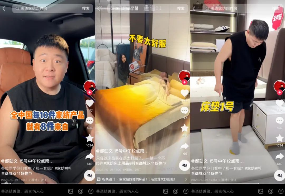 比如在秋冬之际,家纺迎来换季换新的增长旺季。南通是家纺垂类产业的发源地,抖音电商作者@郝劭文 采取了全新的走播模式——带领屏幕前的用户“直达”南通溯源地,让他们进一步见证南通家纺的品质,并自由挑选自己喜欢的花色下单。沉浸式的购物体验吸引了用户驻足、互动,也进一步拉高了直播间人气。同时,郝劭文通过优选好价、爆款产品的认知,来增进购买意向,加速转化。在溯源模式之下,郝劭文直播间最高在线达8万人。