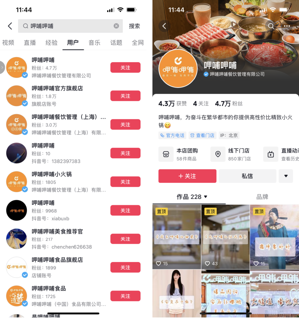 呷哺呷哺在抖音也同样建立了的账号矩阵,视频内容以产品推广和活动介绍为主,主页还设置了团购套餐和店铺的引流触点。