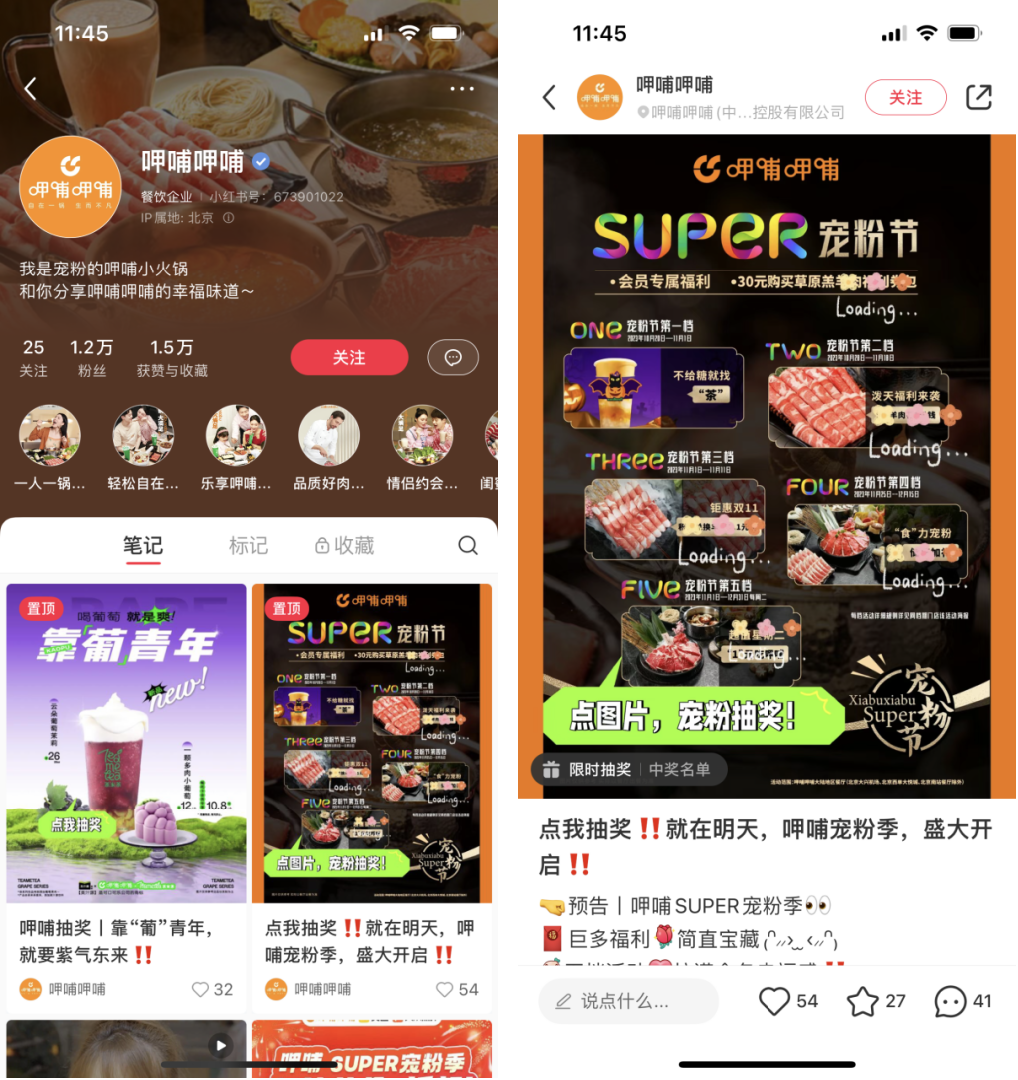 呷哺呷哺小红书相关笔记超过1万+篇。笔记内容主要以品牌活动为主,推文会设置抽奖活动,增加内容的曝光度,吸引用户线下产生购买。