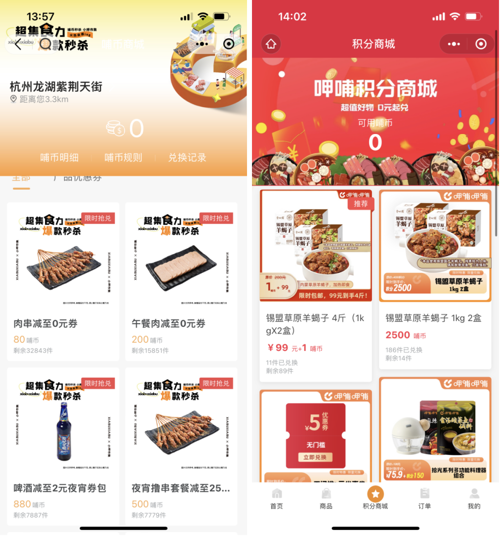 「哺币」可用于兑换食品小菜的优惠券及代金券,例如80哺币可兑换烤串1串、200哺币可兑换午餐肉1份。还可以在集团的积分商场中,实现“积分+现金”的换购。