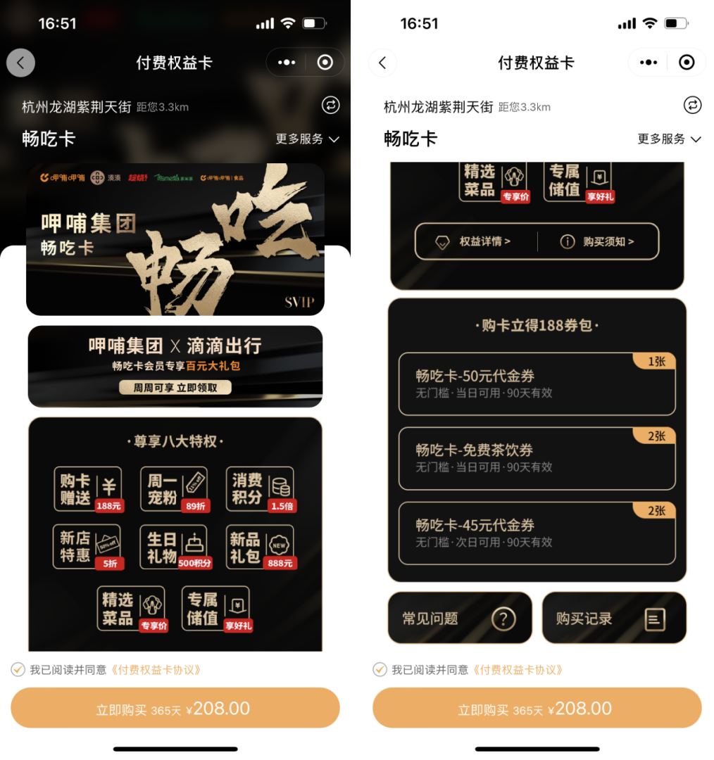 2023年5月,呷哺呷哺也推出了自己的付费会员「畅吃卡」——售价208元/年,享受包括新品礼包、188券包、消费积分在内的多项特权。