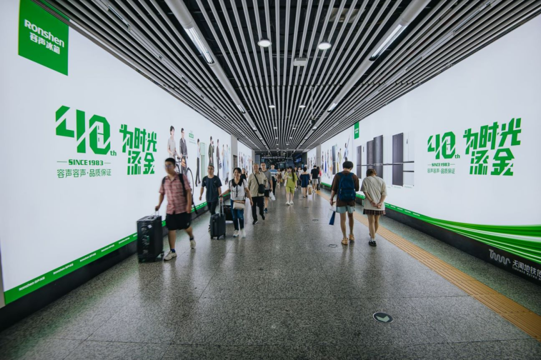 从9月9日开始,容声冰箱在广东、长沙和重庆的地铁通道设置了“容声40年 为时光添金”主题展,巧妙将容声冰箱40年的发展沿革结合在条形画面里,形成了独属于容声冰箱的沉浸空间。